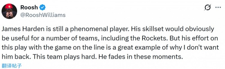 足球比分网12月13日讯 休斯敦播客主持人@RooshWilliams发推谈及哈登。 他写道:“詹姆斯·哈登依然是一位现象级的球员。他的技术特点显然对很多球队都有用,包括火箭队。但他在比赛关键时刻的表现,恰恰说明了我为什么不想让他回归。火箭打球很拼,而他却在这种时刻掉链子。”