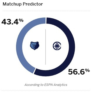 足球比分网12月15日讯 明天上午11:30,灰熊客场对阵快船。 今天ESPN给出本场比赛的获胜概率预测,其中灰熊为43.4%,快船为56.6%。