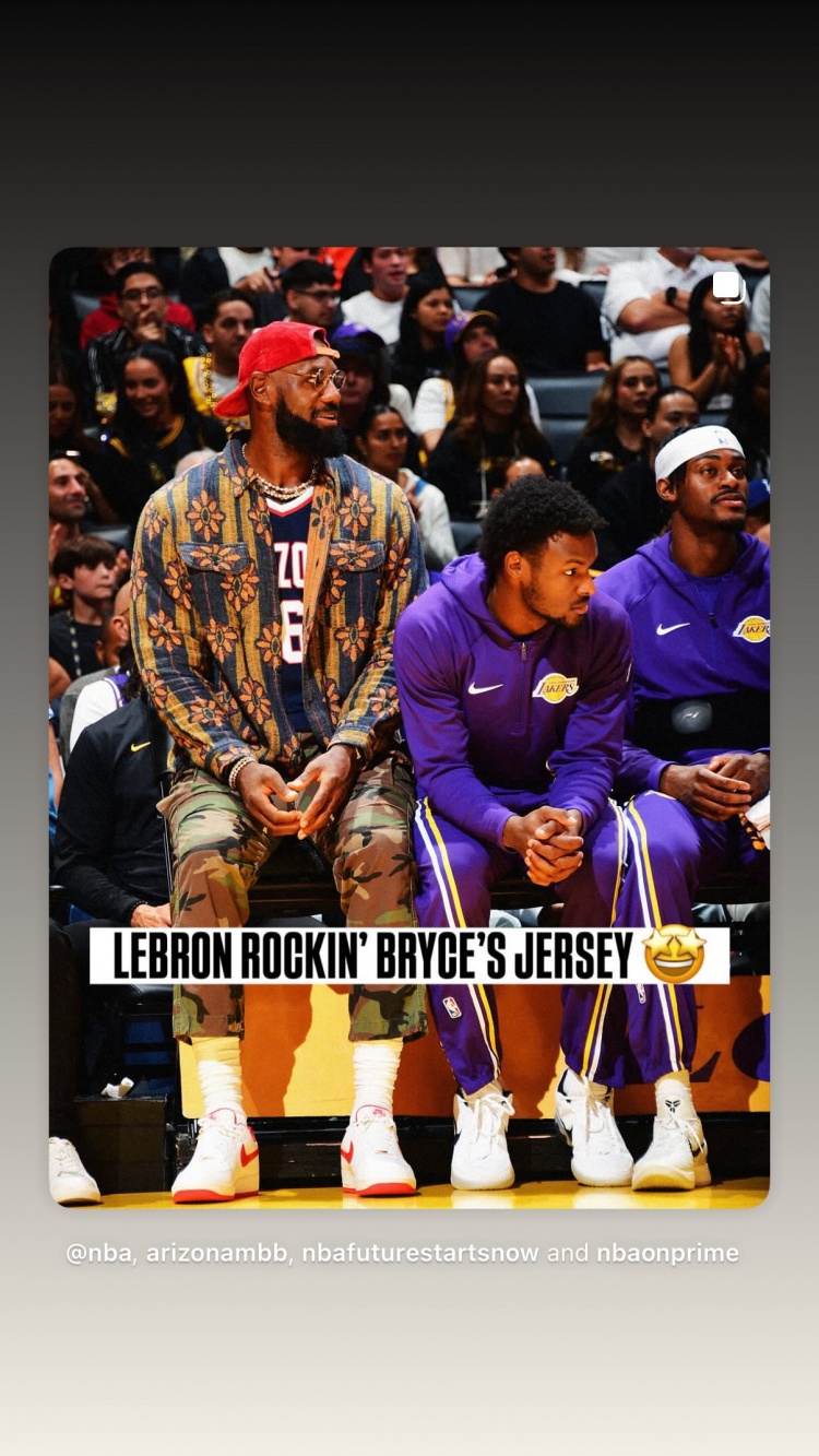 足球比分网10月26日讯 昨日湖人主场迎战森林狼,詹姆斯身穿小儿子布莱斯在亚利桑那大学的球衣到场观赛。 今日詹姆斯更新IG动态晒出多张现场观赛照。...