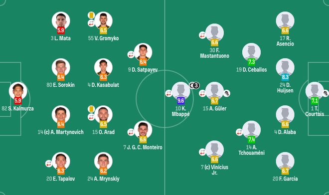 在北京时间10月1日结束的欧冠联赛阶段第2轮一场焦点战中,皇马在客场5-0完胜阿拉木图凯拉特队,欧冠开局2连胜。上半场,维尼修斯失单刀,马斯坦托诺造点,姆巴佩主罚打破僵局。下半场,库尔图瓦长传助攻,姆巴佩再进2球完成帽子戏法,卡马文加锁定胜局,迪亚斯读秒锦上添花。 【关键焦点】 第23分钟,阿拉木图后卫解围失误,马斯坦托诺禁区上抢被凯拉特门将放倒,裁判果断判罚点球,姆巴佩主罚点球破门,阿拉木图0-1皇马。 第52分钟,库尔图瓦长传送出助攻,姆巴佩加速超车形成单刀后轻松破门,皇马2-0锁定胜局。 第74分钟,罗德里戈奔袭策动,居勒尔助攻,姆巴佩弧顶推射破门,完成帽子戏法,皇马3-0领先。 本场戴帽后,最近6场皇马比赛,姆巴佩均取得进球,共打进10球。姆巴佩已在欧冠打入60球,独占欧冠历史射手榜第6位,距离第5的劳尔相差11球。 第84分钟,罗德里戈左路带球突破后传中,卡马文加头球破门再下一城,皇马4-0锁定胜局。 读秒阶段,贡萨洛助攻迪亚斯锦上添花,皇马5-0大胜。 【精彩回放】 第13分钟,维尼修斯突入禁区准单刀机会挑射,皮球偏出球门。 第18分钟,居莱尔中路推射被挡出底线。 第21分钟,皇马前场连续短传配合,姆巴佩兜射远角被门将扑出底线。 第35分钟,姆巴佩兜传禁区右侧,马斯坦托诺闪开角度抽射稍稍打偏。 第44分钟,姆巴佩禁区右侧穿裆过人后兜射,皮球稍稍偏出球门。 第58分钟,皇马错失绝佳良机,维尼修斯横传,姆巴佩面对门将推射将球打偏。 第68分钟,葛罗米柯禁区内倒地,裁判观看VAR后表示不是点球。 【球员评分】 【数据统计】 【出场阵容】 皇马首发:1-库尔图瓦、17-阿森西奥、24-赫伊森、4-阿拉巴、20-弗兰-加西亚、14-楚阿梅尼(80'6-卡马文加)、19-塞瓦略斯、15-居莱尔(80'5-贝林厄姆、30-马斯坦托诺(70'21-迪亚斯)、7-维尼修斯(70'11-罗德里戈)、10-姆巴佩(81'16-贡萨洛-加西亚) |
