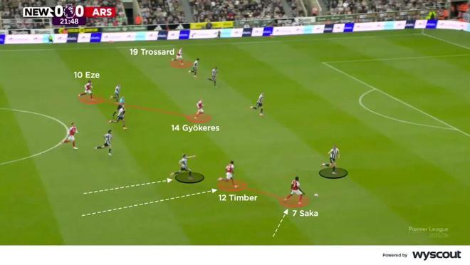 本文选译自Coaches' Voice。 两队利用边路进攻 本场比赛,双方都通过边路发起进攻,边后卫频繁前插支援边锋。阿森纳主要在右路展开。球队排出4-2-3-1阵型,廷贝尔与萨卡联手冲击丹·伯恩,从而避开纽卡斯尔中路的密集防守。戈登在这一侧积极回防,限制了他在廷贝尔身后空间中的反击威胁。相比之下,阿森纳左路的特罗萨德在进攻中缺乏卡拉菲奥里的稳定支援。中路的埃泽则作为前腰站在中锋哲凯赖什身后。上半场他只能在二次进攻中,于禁区边缘获得几次射门机会。 纽卡斯尔在前场的进攻套路与之类似。右后卫利夫拉门托大幅前插支援墨菲。后者在进攻时常常收窄位置,以便在高位防守时也能对阿森纳中卫施压。身高1米98的沃尔特马德是显而易见的传中目标,而同样高大的丹·伯恩也会偶尔前插进禁区,提供制空点。伯恩并不会套上传中,而是直接杀入禁区。纽卡斯尔倾向从右路组织,由中场迅速将球转移到这一侧,创造传中机会,送向沃尔特马德和伯恩。 两队中锋哲凯赖什和沃尔特马德也会拉到边路,帮助球队由守转攻。边后卫的前压留出了宽阔的外侧空间,两名前锋在这里接应并与插上的队友配合。哲凯赖什经常拉开中卫,然后与内收的萨卡进行二过一,再快速把球转向另一侧,迫使纽卡斯尔后防来不及调整。阿森纳本场最佳机会就来自一次这样的转移,最终特罗萨德的射门击中立柱。 纽卡斯尔同样会把阿森纳中卫牵扯离开位置,利用他们留下的空档。沃尔特马德更多在左路接应,他所利用的空间往往来自廷伯的前插。纽卡斯尔的中场进攻力量比阿森纳更强,他们的阵型让两名8号球员能够不断前插,与中锋形成配合。托纳利、乔林顿和吉马良斯都曾高位插上,填补沃尔特马德拉开的空档。不过,纽卡斯尔取得领先的进球最终来自一次角球的短传配合,沃尔特马德在禁区内完成终结。 阿尔特塔与埃迪·豪的调整 半场时,阿尔特塔用萨利巴换下莫斯克拉,并微调了进攻体系。随着比赛进入下半场,纽卡斯尔摆出更加稳定的中场区域防守。对此,阿森纳在出球时常形成三后卫结构,卡拉菲奥里前插到左路并拉开宽度,特罗萨德内收,与埃泽一起站在双后腰身前。这样一来,阿森纳在中路的传递联系更紧密,有效对抗纽卡斯尔的窄中场。廷贝尔则在较深的位置,配合萨卡制造威胁。 这种调整让阿森纳在下半场控制了比赛,限制纽卡斯尔只能通过边路反击。右路进攻尤为高效,埃泽有时还会回撤组织,配合萨卡完成穿透性传递。萨卡内切的时机非常精准,让廷贝尔能够套上传中,成为重要威胁。随着右路持续制造麻烦,这一侧的后腰苏比门迪能稳守后场,赖斯则得以在特罗萨德前插时向前跟进,增加攻击力。 埃迪·豪则用三个换人做出回应,改打五后卫,利夫拉门托移到左翼卫,伯恩内收担任中卫,若埃林顿也移到中场左侧保护边路。这样虽然削弱了他们的反击人数,但有效压缩了阿森纳的边路配合。纽卡斯尔边路与中路的球员集体横移,迫使阿森纳沿边线推进,随后由翼卫封锁路线,中卫提供补位支持。若阿森纳尝试转移球,另一侧的球员也能及时覆盖。 纽卡斯尔的防守体系非常稳固,而阿森纳依靠角球套路才锁定胜局。结合本场比赛和水晶宫战胜利物浦的案例,再次证明定位球往往能在顶级较量中成为决定胜负的关键因素。 ⬇️在各个平台关注我们,获得持续更新。⬇️ |