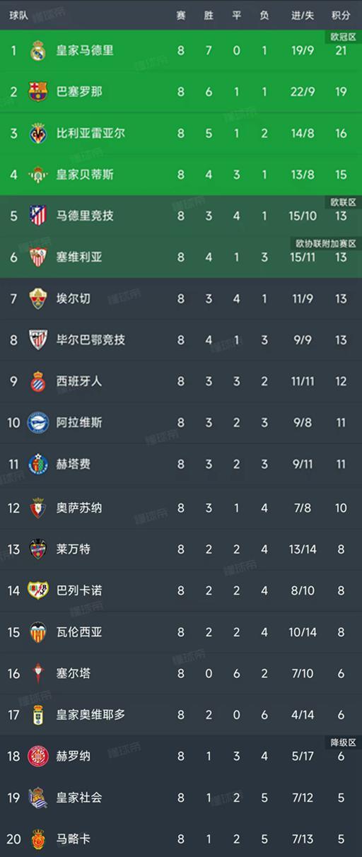 随着巴萨1-4,马竞1-1,西甲第8轮最新积分榜如下