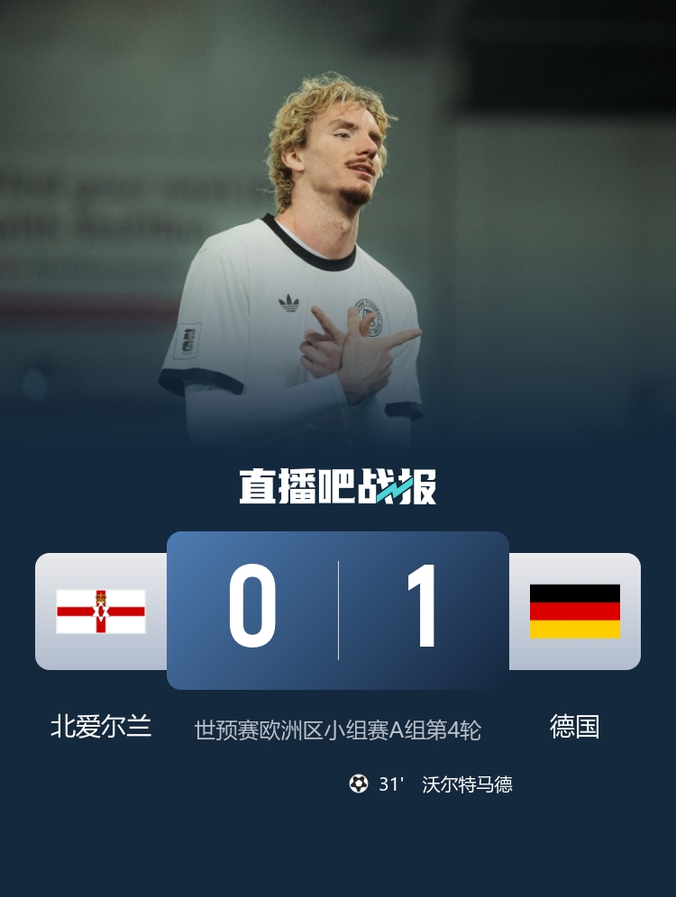 世预赛非洲区小组赛D组,世界排名第70的佛得角3-0斯威士兰,锁定小组第1,队史首次晋级世界杯,成为第22支晋级2026世界杯的球队。 世预赛-德国1-0北爱尔兰取3连胜 沃尔特马德制胜阿德耶米失单刀