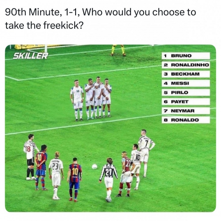 90分钟,1-1,你会选择谁来踢这个任意球? C罗、内马尔、帕耶、皮尔洛、梅西、贝克汉姆、小罗……还是B~~~~~~~~费~~~~~~?
