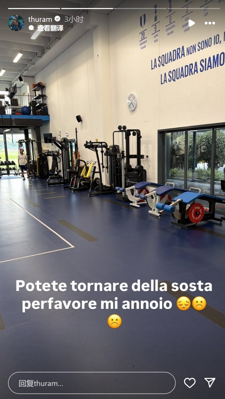 足球比分网10月13日讯 国米前锋图拉姆社媒喊话队友,希望他们快点从国家队回到俱乐部。 图拉姆因左腿股二头肌受伤缺席10月份的国家队比赛,他留在俱乐部进行康复训练,图拉姆社媒晒出空荡荡健身房的照片,配文:“求你们快点从国家队回来吧,我好无聊。” 根据意大利天空体育的报道,图拉姆预计将缺席国米对阵罗马的比赛。 |