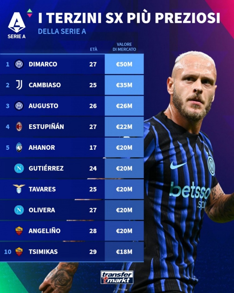 德转盘点意甲左后卫身价排名:迪马尔科5000万欧