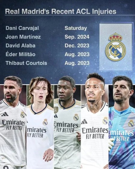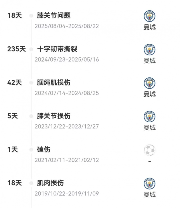 【ACL席卷足坛,不堪回首的噩梦】 2024/25赛季初,罗德里遭遇膝盖前十字韧带撕裂(ACL)的重伤,休战235天。以金球先生的受伤为转折点,曼城褪去了“七年六冠”时期的光环,提前进入了重建期。