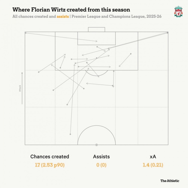 维尔茨自己倒是说过,他并不在意这笔转会费。可问题是,赛季初利物浦五场比赛全胜的时候(维尔茨也有首发),他开局慢热这事儿还没什么人提。等到最近两场一输,他就免不了被大家拿出来审视了。 周六客场打水晶宫,他被安排在前场三叉戟的左路,还拿到了自由内切的战术权限——这是斯洛特一次挺重要、也挺少见的战术调整,可惜最后没奏效,球队1比2输了。 三天后欧冠客战加拉塔萨雷,这位德国球员回到了自己最喜欢的十号位,可他还是利物浦阵中几个明显没踢开的球员之一。 当然,维尔茨到现在的表现也不是一直很差,甚至可以说,绝对不是。 多场比赛“存在感”不强的他,也有过高光时刻,特别是上个月在安菲尔德3比2赢下马竞的欧冠比赛,那时候他的实力还是能闪出来。 就拿对加拉塔萨雷这场来说,他传出了几脚好球,在球队0比1落后的下半场,还创造了利物浦为数不多机会中的两次: 第一次,他一脚直塞让伊萨克拿到了机会,可惜后者起脚太急了…… ……之后,他又给布拉德利送出了一记传中,但这位右后卫没能把球射在门框范围内。 维尔茨确实在八月的社区盾杯助攻埃基蒂克,攻破了水晶宫的球门。可到了正式比赛,他却成了社交媒体上“007”梗的代表人物(现在这个数字已经扩大到8场了)。 不过,真要一场场去分析他的表现,其实他每场都有机会打破这个尴尬纪录。包括在社区盾比赛在内,维尔茨本赛季在所有比赛中一共创造了21次机会。在英超球员里,只有被曼城租借到埃弗顿的格拉利什能与他相比。 对阵马竞的比赛中,萨拉赫本来接他传球后完全该进球的,结果一脚射门打在了门柱上。 同一场比赛早些时候,在和伊萨克打出一串挺漂亮的配合之后,弗林蓬也错失了一次绝佳机会,没能把利物浦的领先扩大到3比0。 维尔茨自己客场对水晶宫时,接到索博斯洛伊的传中,那一下其实也该处理得更好。 问题在于,维尔茨在场上虽然挺忙活,但总让人觉得他没起到什么特别有效的作用。 他在英超和欧冠中创造的17次机会,累计预期助攻值只有1.4——这其实说明,他并没有创造出太多真正有威胁的机会。