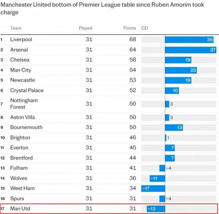 【耻辱纪录一箩筐,阿莫林没有借口】 自2024年11月上任以来,阿莫林率领曼联踢了47场比赛,战绩为17胜12平18负,胜率仅为36.17%,成为了80年来(1945年)胜率最低的红魔主帅。曼联在阿莫林时代取得的胜利多半出现在欧联杯赛场,他们在英超赛场仅斩获8场胜利(半数为升班马),却遭遇了7场平局和16场失利,胜率只有25.81%,净胜球数为-13,31轮拿31分的成绩在英超处于垫底水平(除了升降级球队)。