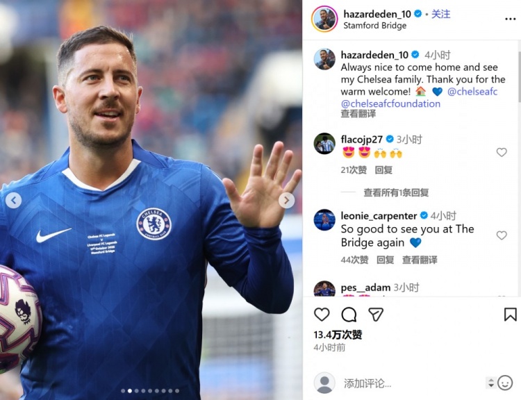 重返斯坦福桥参加传奇赛,阿扎尔:见到切尔西