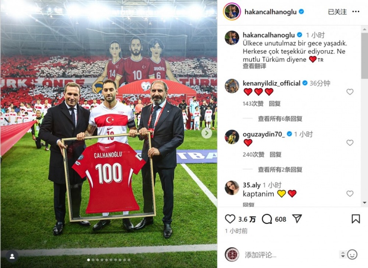 已是传奇!恰尔汗奥卢赛前获赠国家队百场纪念