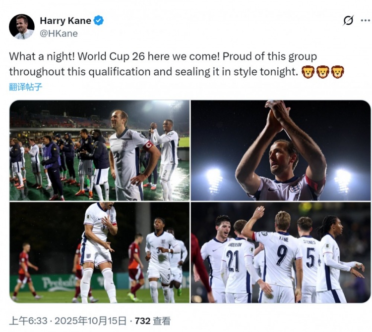 凯恩社媒庆祝出线:2026年世界杯我们来了,为球