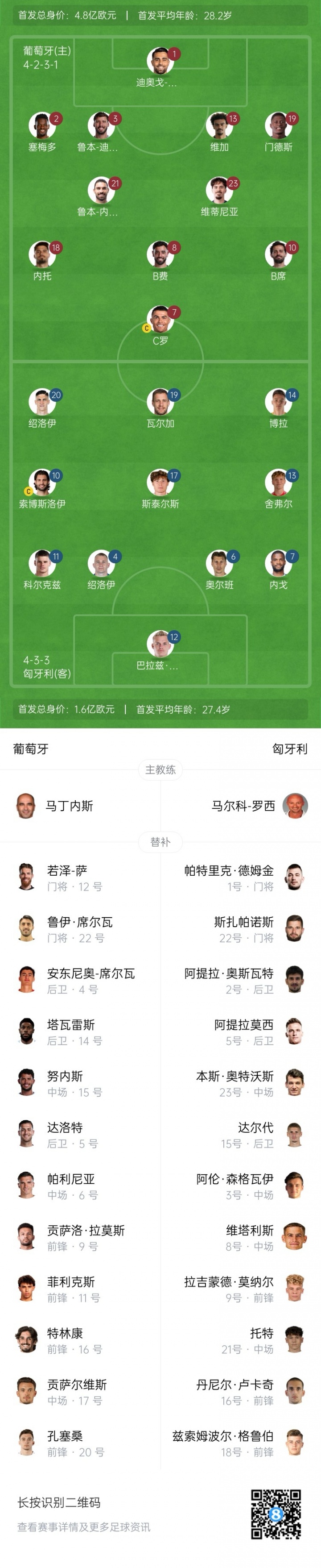 葡萄牙vs匈牙利首发:C罗、B席、B费先发,索博斯