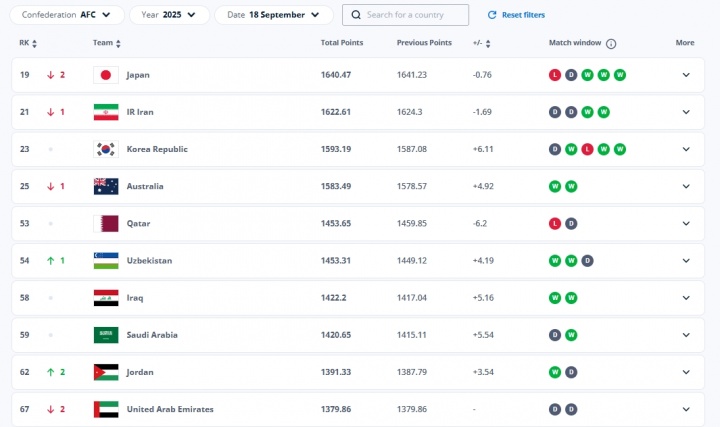 符合排名无意外!FIFA亚洲前十:8队直通世界杯,