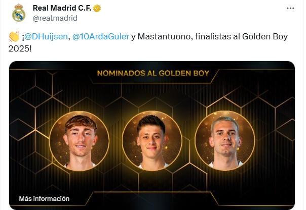 足球比分网10月16日讯 《都灵体育报》公布2025年金童奖25人候选,皇马有三人入选,分别是赫伊森、居莱尔和马斯坦托诺。 因与《法国足球》关系不佳,皇马此前并未在社媒或官网祝贺入选金球候选的球员,但这次他们在社媒和官网都祝贺了赫伊森、居莱尔和马斯坦托诺。