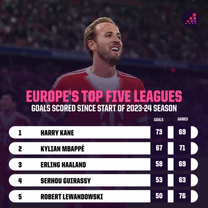 23-24赛季以来五大联赛射手榜:凯恩73球居首,姆