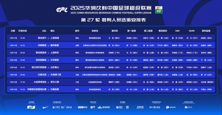 足球比分网10月17日讯 中国足协公布中超第27轮裁判安排,孟祥昆执法浙江vs泰山,麦麦提江执法玉昆vs津门虎。 附中超第27轮裁判安排: 10月17日18:00 青岛海牛vs上海海港 主裁判:王竞 VAR:甄伟 10月17日19:35 成都蓉城vs梅州客家 主裁判:邢琦 VAR:顾春含 10月17日20:00 青岛西海岸vs上海申花 主裁判:甘树然 VAR:李海新 10月18日16:00 深圳新鹏城vs北京国安 主裁判:金京元 VAR:张杨帆 10月18日19:35 浙江队vs山东泰山 主裁判:孟祥昆 VAR:张雷 10月18日20:00 云南玉昆vs天津津门虎 主裁判:麦麦提江 VAR:徐强强 10月19日15:30 大连英博vs武汉三镇 主裁判:唐顺齐 VAR:何鑫 10月19日19:35 河南队vs长春亚泰 主裁判:刘威 VAR:贺凯 |