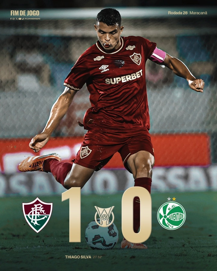 足球比分网10月17日讯 巴甲第28轮,弗鲁米嫩塞主场1-0绝杀尤文图德,41岁中卫队长蒂亚戈-席尔瓦绝杀! 比赛第98分钟,蒂亚戈-席尔瓦凌空侧钩打进一粒杂耍式的进球,收获本赛季巴甲首球,帮助弗鲁米嫩塞1-0绝杀尤文图德拿下胜利,对方门将呆若木鸡目送进球。