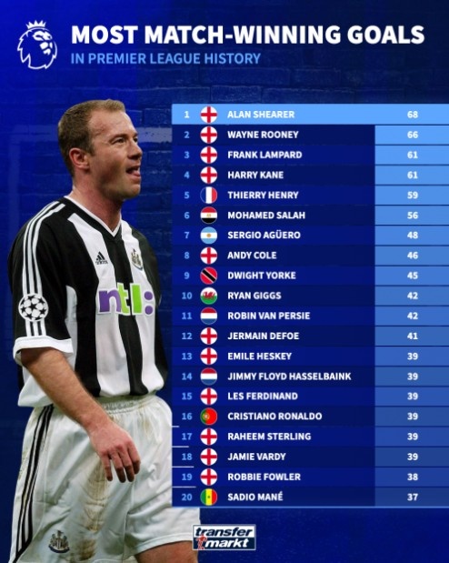 英超历史打进制胜球球员排行:希勒68球居首,鲁