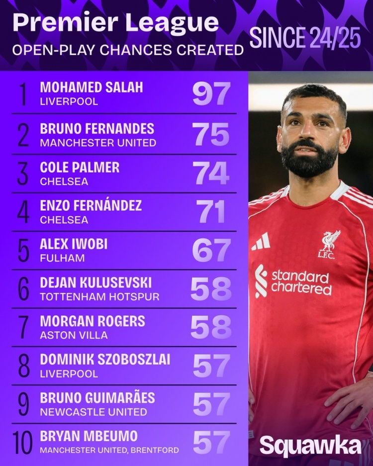 足球比分网10月16日讯 日前,Squawka统计了24/25赛季以来英超运动战创造机会次数排行,萨拉赫居首,B费、帕尔默分居二三位。 1、萨拉赫(利物浦):97次 2、B费(曼联):75次 3、帕尔默(切尔西):74次 4、恩佐(切尔西):71次 5、伊沃比(富勒姆):67次 6、库卢塞夫斯基(热刺):58次 7、摩根-罗杰斯(维拉):58次 8、索博斯洛伊(利物浦):57次 9、吉马良斯(纽卡):57次 10、姆伯莫(曼联/布伦特福德):57次