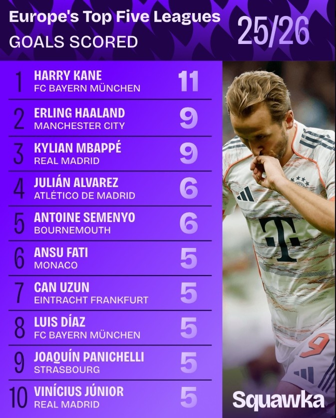 足球比分网10月17日讯 本周末,欧洲五大联赛将重燃战火。Squawka盘点了本赛季迄今为止五大联赛进球数情况,凯恩以11球居首,哈兰德和姆巴佩均打进9球紧随其后。 以下为具体排名情况: 1、凯恩(拜仁):11球 2、哈兰德(曼城):9球 3、姆巴佩(皇马):9球 4、阿尔瓦雷斯(马竞):6球 5、塞梅尼奥(伯恩茅斯):6球 6、法蒂(摩纳哥):5球 7、乌尊(法兰克福):5球 8、路易斯-迪亚斯(拜仁):5球 9、帕尼切利(斯特拉斯堡):5球 10、维尼修斯(皇马):5球