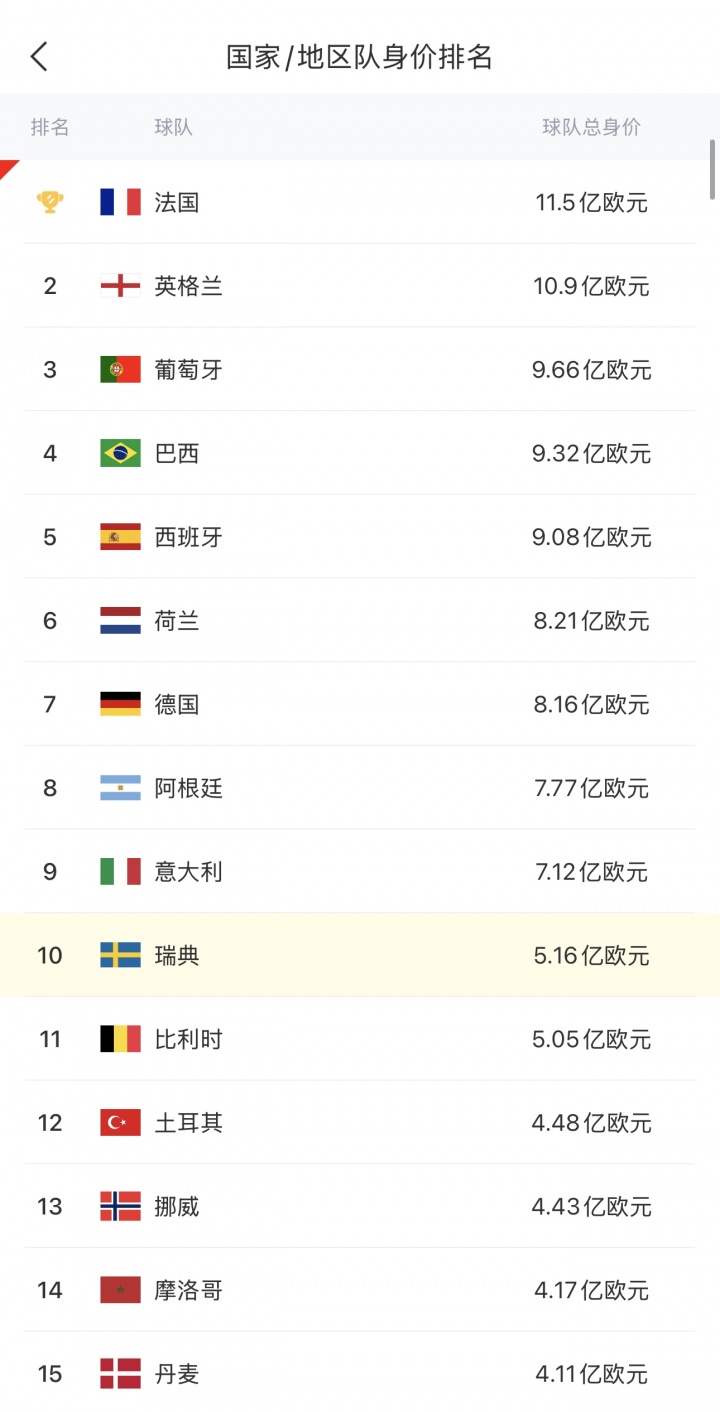 瑞典全队身价高达5.16亿欧,位列世界第10,阵中有身价1.4亿欧的伊萨克(利物浦)、7500万欧的约克雷斯(阿森纳)、5500万欧的伊兰加(纽卡)、4000万欧的雨果-拉尔森(法兰克福)、4000万欧的贝里瓦尔(热刺)和3000万欧的希恩(亚特兰大)。