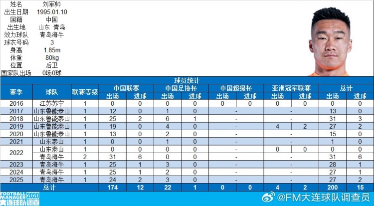 足球比分网10月18日讯 据博主“FM大连球队调查员”统计,昨天青岛海牛3-4不敌海港的比赛,青岛海牛队球员刘军帅完成了代表中国俱乐部各项职业赛事出场200场里程碑。 200场出场当中,刘军帅共打入15球,其中代表青岛海牛出战113场,攻入10球;代表山东泰山出战87场,攻入5球。 |