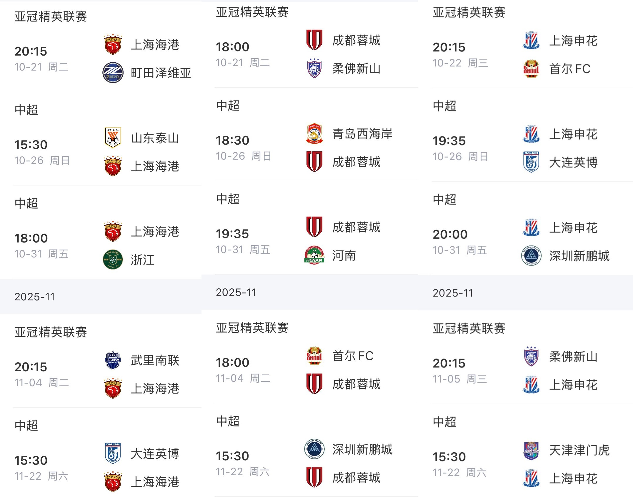海港打泰山浙江英博 蓉城打西海岸河南深圳 申花 时间: 2025-10-18 来源: 网络 作者: admin 足球比分网10月17日讯 中超还剩最后3轮,海港、蓉城、申花剩余赛程如下。除此以外,国安本轮未赛,他们剩余4场将对阵深圳、海牛、亚泰和梅州。 上一篇:中超积分榜:海港仍2分领跑,蓉城第2,申花第 下一篇:卡内达:从上个赛季到现在没赢过强队,明天是