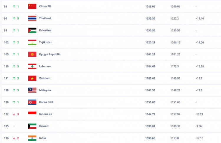 足球比分网10月17日讯 FIFA更新最新一期国家队排名,亚足联国家队方面,国足积分不变,但排名从世界第94位升至世界第93位,亚洲排名则仍是第14位。 亚足联国家队前25名(括号内的数字为世界排名): 1.日本(19) 2.伊朗(21) 3.韩国(22) 4.澳大利亚(25) 5.卡塔尔(52) 6.乌兹别克斯坦(55) 7.伊拉克(57) 8.沙特(58) 9.约旦(66) 10.阿联酋(67) 11.阿曼(79) 12.叙利亚(86) 13.巴林(90) 14.中国男足(93) 15.泰国(96) 16.巴勒斯坦(98) 17.塔吉克斯坦(102) 18.吉尔吉斯斯坦(105) 19.黎巴嫩(110) 20.越南(111) 21.马来西亚(118) 22.朝鲜(120) 23.印尼(122) 24.科威特(135) 25.印度(136)