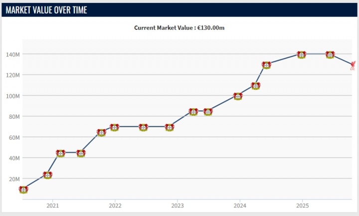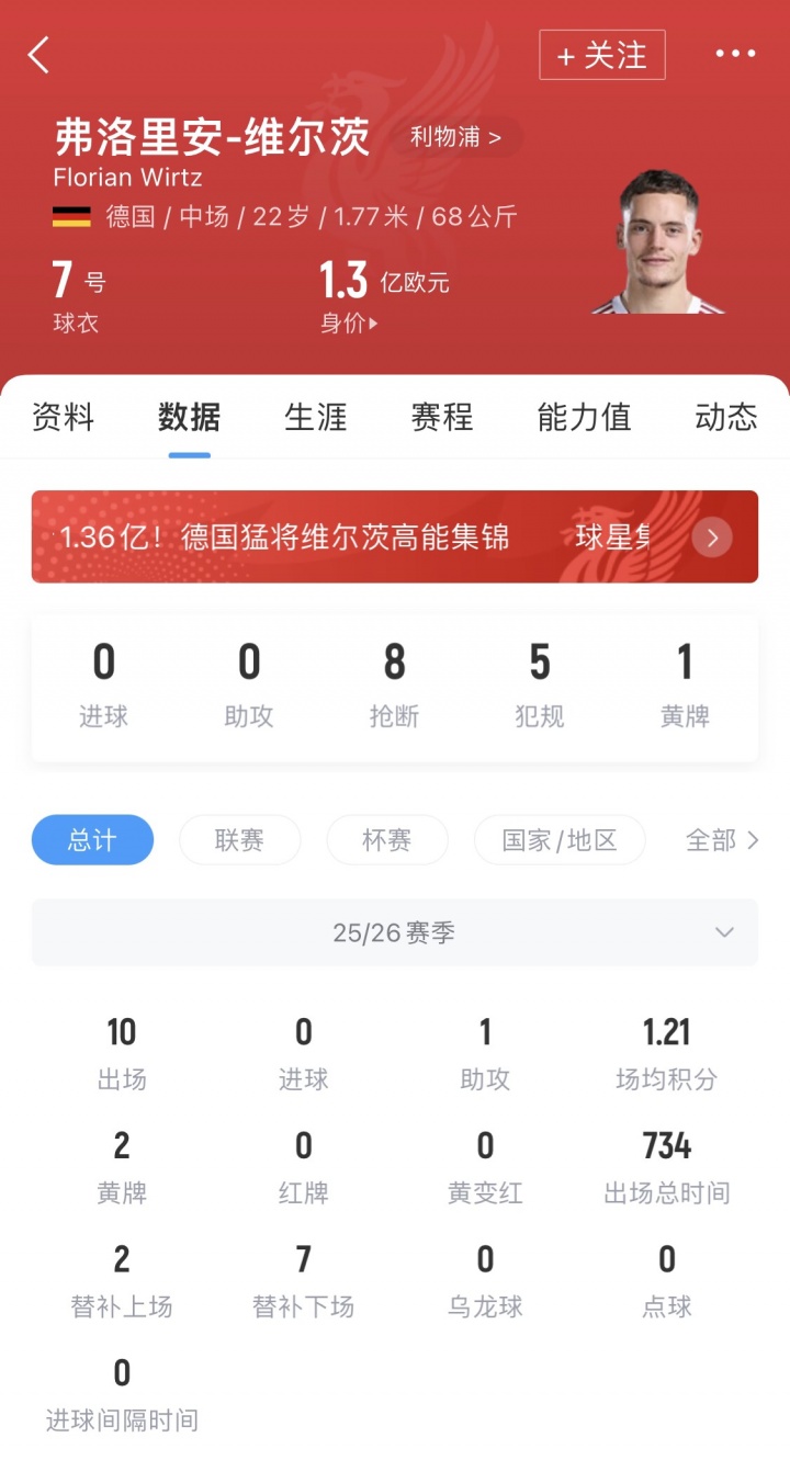 足球比分网10月18日讯 德转昨日更新英超球员身价,今夏加盟利物浦的维尔茨身价下降1000万欧,从原来的1.4亿调整为1.3亿欧。 维尔茨加盟利物浦的初始转会费1.25亿欧,曾创下英超转会费之最,随后被伊萨克以1.45亿欧打破。 关于维尔茨转会费的下调,德转解释道:“维尔茨是本次身价更新中最难评估的球员之一,以如此价格加盟势必背负巨大的期望,但适应环境总是需要时间,他已初现真正的实力。加上容易达成的附加条款,转会费最终可能达到1.4亿欧左右。由于时间还短,他才22岁,我们认为现在下调1000万欧最为合理。”