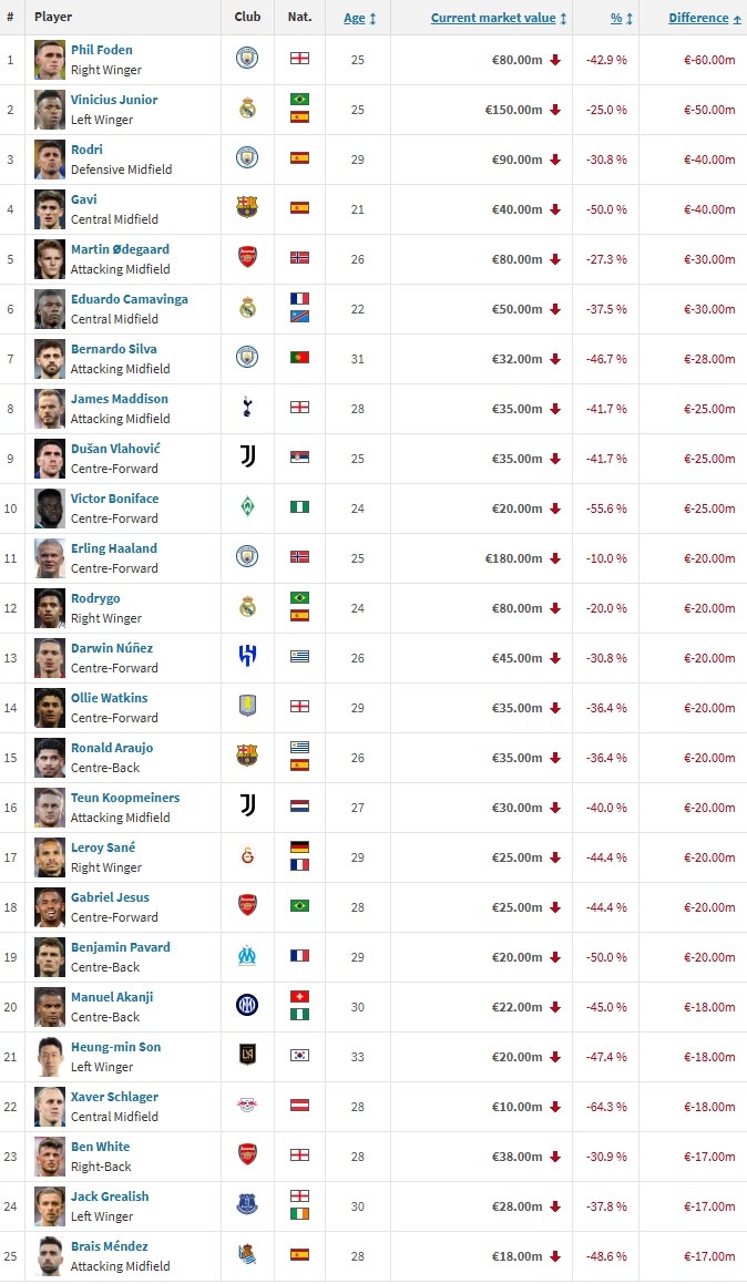 2025年球员身价下跌榜:福登跌6000万欧最多,维尼
