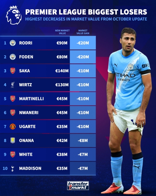 足球比分网10月17日讯 德转更新英超身价,其中跌的最多的是罗德里和福登,他们身价都下降了2000万欧。 英超身价跌幅榜(欧) 1.罗德里 -2000万 现9000万 2.福登 -2000万 现8000万 3.萨卡 -1000万 现1.4亿 4.维尔茨 -1000万 现1.3亿 5.马丁内利 -1000万 现4500万 6.恩瓦内里 -1000万 现4500万 7.乌加特 -1000万 现3500万 8.奥纳纳(维拉)-700万 现4200万 9.怀特 -700万 现3800万 10.麦迪逊 -700万 现3500万