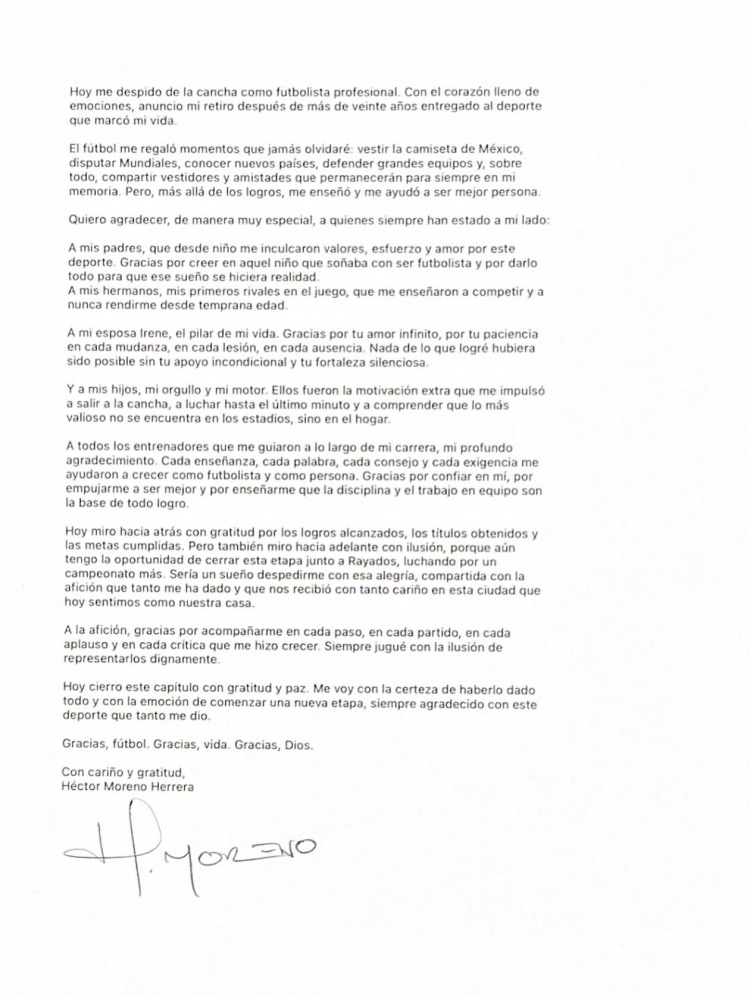 足球比分网10月18日讯 前墨西哥国脚埃克托-莫雷诺更新社媒动态,宣布结束职业生涯。 埃克托-莫雷诺社媒内容: “今日我告别绿茵场,结束职业足球生涯。此刻百感交集,我宣布在献身这项改变我人生的运动二十余载后正式退役。 足球赋予我永生难忘的时刻——身披墨西哥战袍征战世界杯,踏遍异国他乡,效力于顶级球队,更珍贵的是与队友们共用更衣室的岁月和永存记忆的友谊。但超越成就的是,它教会我成为更好的人。 我要特别感谢始终陪伴在我身边的人们——感谢我的父母,自幼便将价值观、奋斗精神和对这项运动的热爱灌输于我,感谢你们相信那个梦想成为足球运动员的孩子,并倾尽全力让梦想成真。 感谢我的兄弟们,他们是我最早的球场对手,从小就教会我竞争精神和永不言弃的信念。 感谢我的妻子艾琳,她是我生命的支柱。感谢你无尽的爱,感谢你每次搬家、每次我受伤和缺席时展现的耐心。没有你无条件的支撑和默默的坚强,我所取得的任何成就都不可能实现。 感谢我的孩子们,他们是我的骄傲与动力,也是我奔赴赛场的额外激励,鼓舞着我奋战至最后一刻,更让我明白最珍贵的财富不在球场,而在家庭。 感谢在我职业生涯之中指导过我的所有教练,你们的每次教诲、每句叮嘱、每条建议与要求,都助我成长为更优秀的球员与更成熟的人。感谢你们给予我信任,鞭策我不断进步,更教会我纪律与团队协作是成就一切的基础。 今日我满怀感激地回顾过往成就、夺得的冠军与达成的目标。但我也满怀憧憬地展望未来,因为我仍有机会与蒙特雷队一起结束这段旅程,为又一座冠军奖杯而战。若能与球迷们共享夺冠的喜悦,在这座如今已成为我们家的城市里,以这样的方式告别,那将为这段旅程画上最梦幻的句点。 球迷们,感谢你们陪伴我走过的每一步、每一场比赛、每一次掌声和每一次批评,正是这些让我不断成长,我始终怀着为你们争光的信念踏上赛场。 今日我怀着感恩与平静翻过人生新篇章。离别之际,我确信自己已倾尽全力,更满怀对新征程的期待,永远感激这项给予我如此丰厚馈赠的运动。 感谢足球,感谢生命,感谢上帝。谨此致以爱与感激, 埃克托-莫雷诺-埃雷拉。” 埃克托-莫雷诺是一位37岁的墨西哥中卫,曾效力阿尔克马尔、西班牙人、埃因霍温、罗马、皇家社会、蒙特雷等俱乐部,为墨西哥国家队出战132场比赛,打进5球,助攻3次。