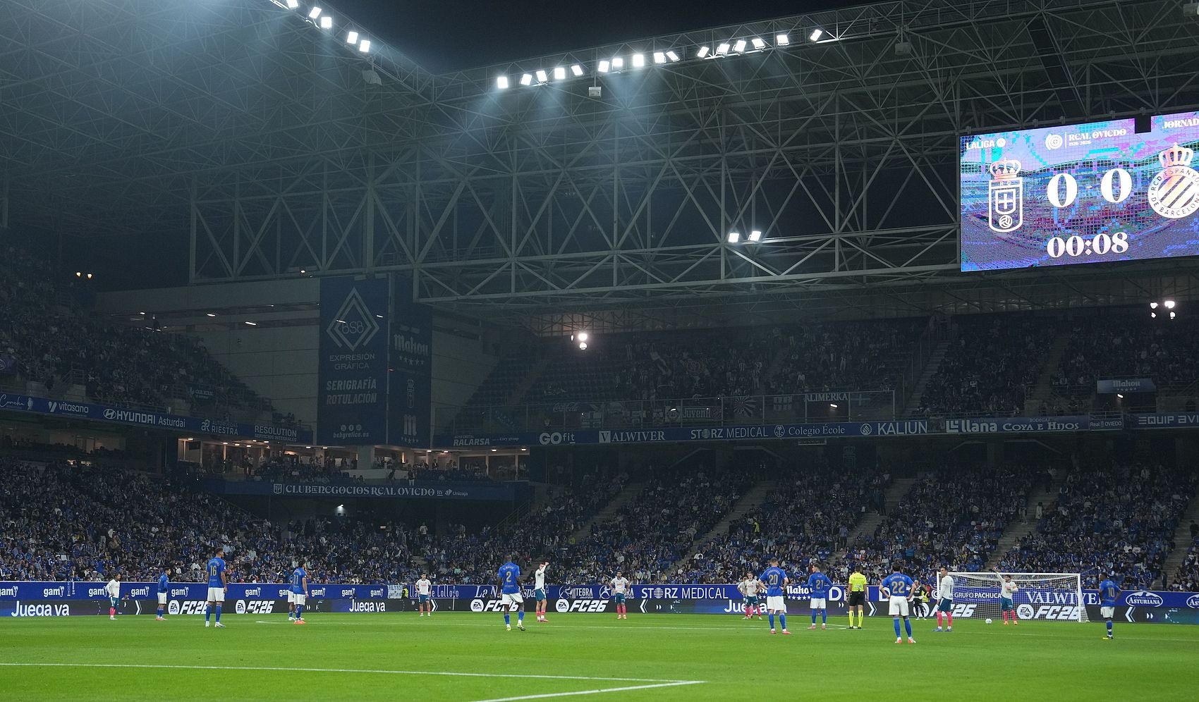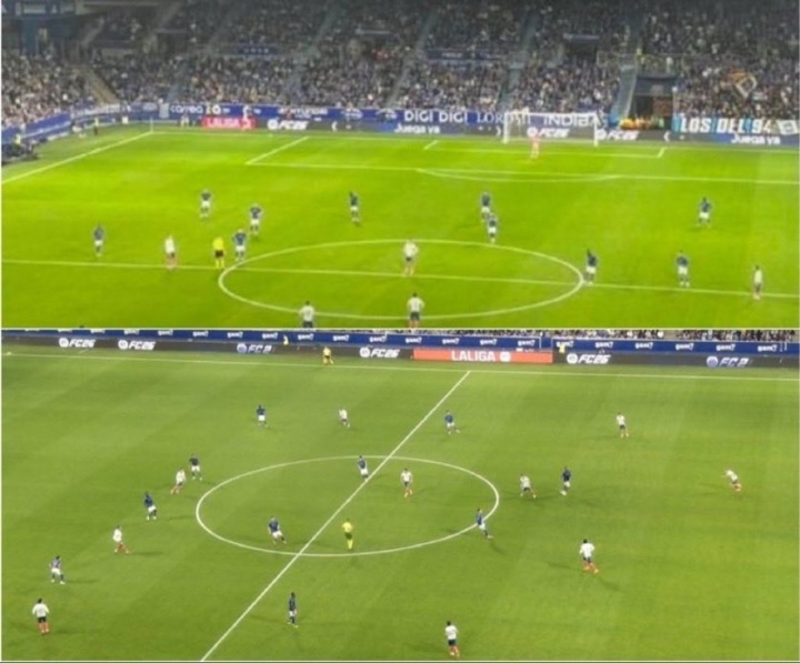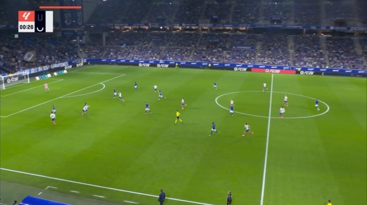 今日进行的西甲第9轮的一场比赛,皇家奥维耶多主场0-2负西班牙人,比赛开场后,双方球员静止25秒以示对西甲海外赛的抗议。 西甲未播出本场比赛的前25秒,主裁吹响开场哨后,镜头马上切到球场的俯瞰视角,放了将近20秒才回到球场内,但给的是双方主帅特写。待到比赛画面恢复,比分牌上的计时器显示已是0分26秒。