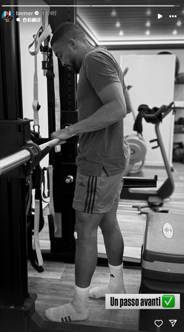 足球比分网10月18日讯 尤文后卫布雷默此前已成功接受左膝半月板手术,预计将缺阵约六周时间。 布雷默社媒晒图:身处健身房,正在进行恢复性训练。照片的右下角配有意大利语文字“Un passo avanti”,意为“向前一步”。 |