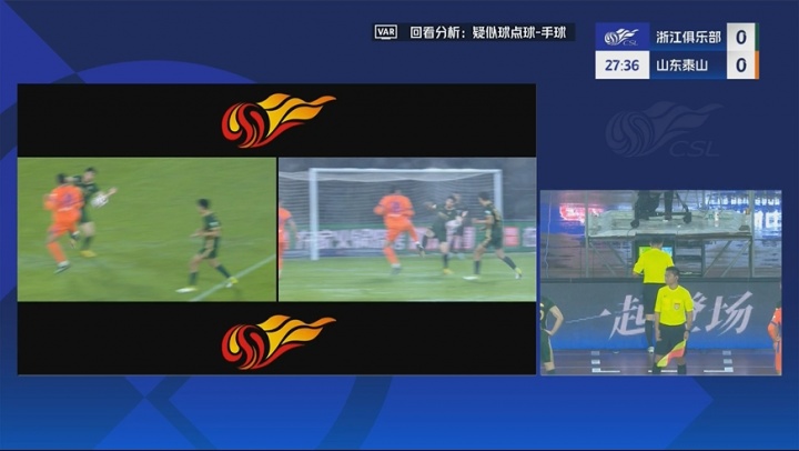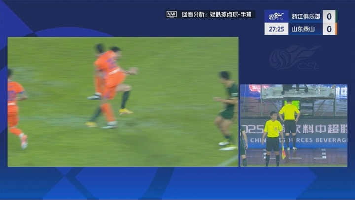 足球比分网10月18日讯 中超第27轮,浙江坐镇主场对阵山东泰山,上半场第28分钟,泽卡禁区内踢球后皮球打在卢卡斯手臂上,主裁亲自回看VAR,没有判罚浙江球员禁区内手球犯规,目前比分仍为0-0。
