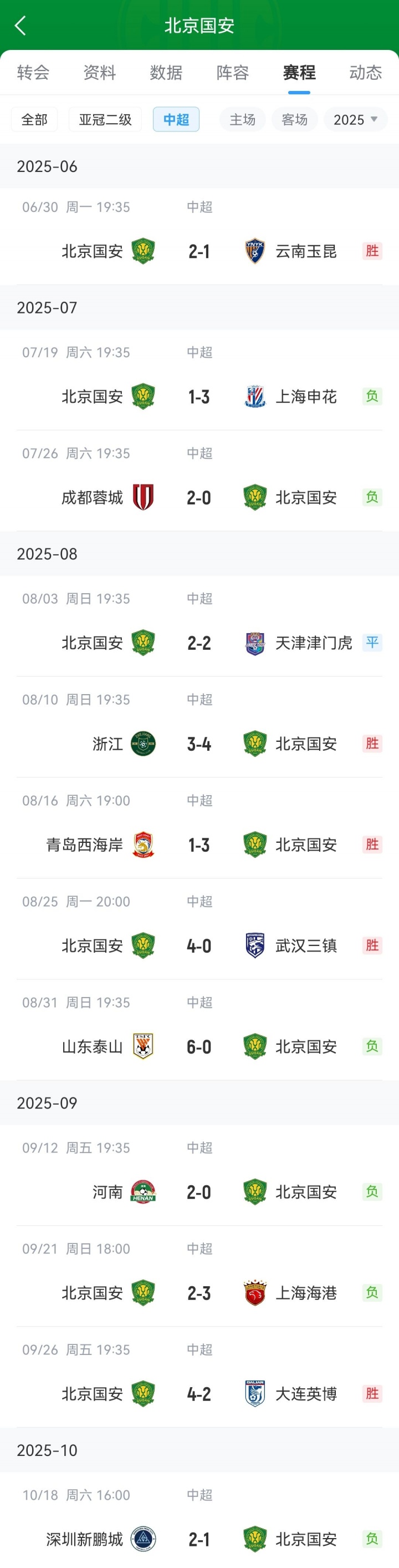 国安下半程已结束赛程↓