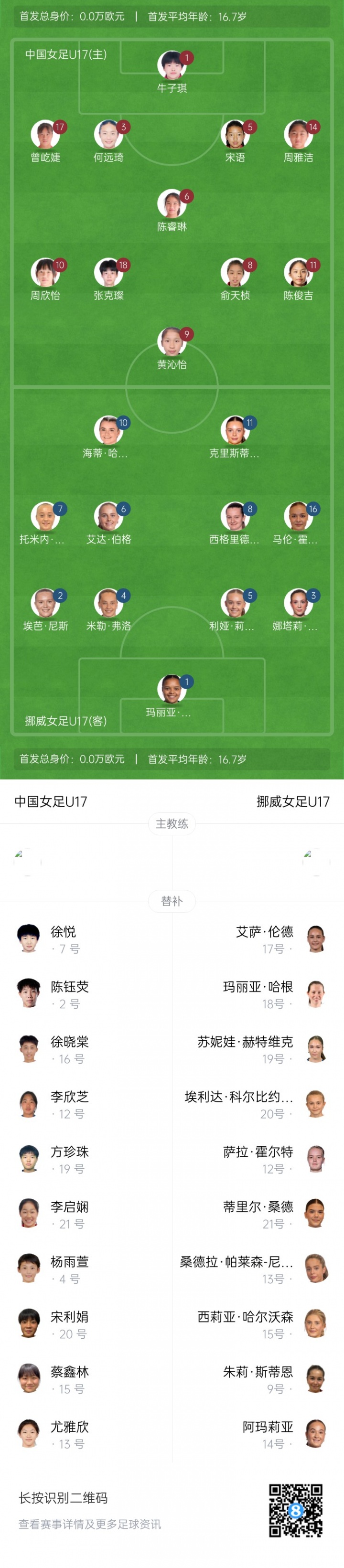 U17女足世界杯-中国U17女足vs挪威U17女足首发:宋