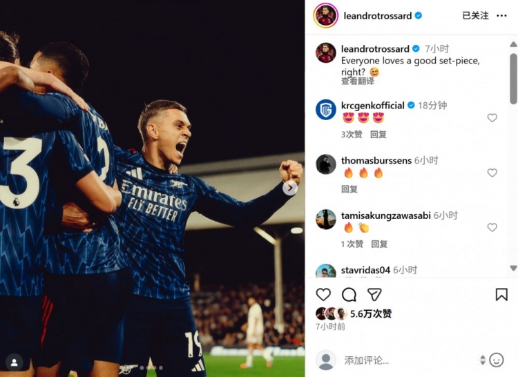 足球比分网10月19日讯 在本轮英超,阿森纳1-0小胜富勒姆,特罗萨德利用角球机会破门得分。 赛后特罗萨德也在个人社媒晒出庆祝进球照片,配文写道:“人人都爱高质量的定位球,难道不是吗 |