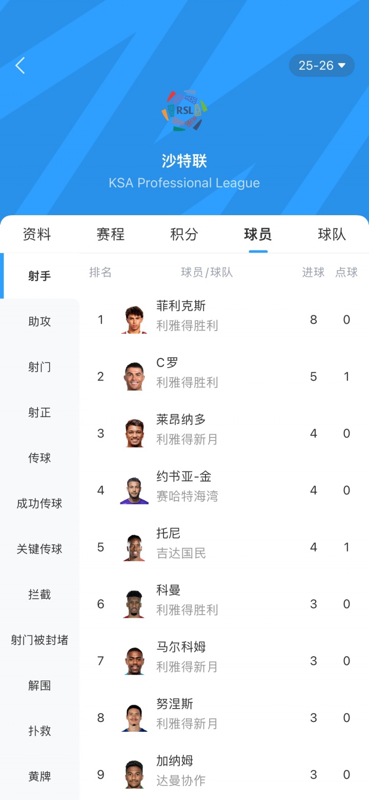 足球比分网10月19日讯 沙特联胜利5-1大胜哈萨征服,菲利克斯帽子戏法助队拿下胜利。 至此,菲利克斯在沙特联5轮实现了2次帽子戏法,1次梅开二度,攻入8球暂时领跑射手榜。C罗打入5球位居第2。