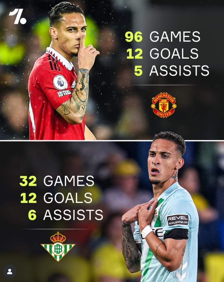 蜕变,安东尼效力贝蒂斯32场参与18球,已超过曼