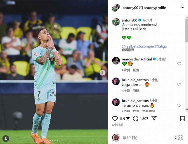 梅开二度+补时绝平!安东尼社媒:我们永不言弃