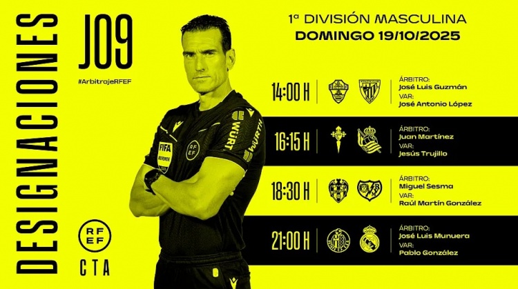足球比分网10月19日讯 西班牙足协官方公布了西甲第9轮部分比赛场次的裁判安排,穆努埃拉执法皇马客战赫塔费。 西甲第9轮部分裁判安排如下: 埃尔切VS毕尔巴鄂竞技 主裁判:何塞-路易斯-古兹曼,VAR裁判:何塞-安东尼奥-洛佩斯; 塞尔塔VS皇家社会 主裁判:胡安-马丁内斯,VAR裁判:赫苏斯-特鲁伊略; 莱万特VS巴列卡诺 主裁判:米格尔-塞斯马,VAR裁判:劳尔-马丁-冈萨雷斯; 赫塔费VS皇马 主裁判:何塞-路易斯-穆努埃拉,VAR裁判:巴勃罗-冈萨雷斯。