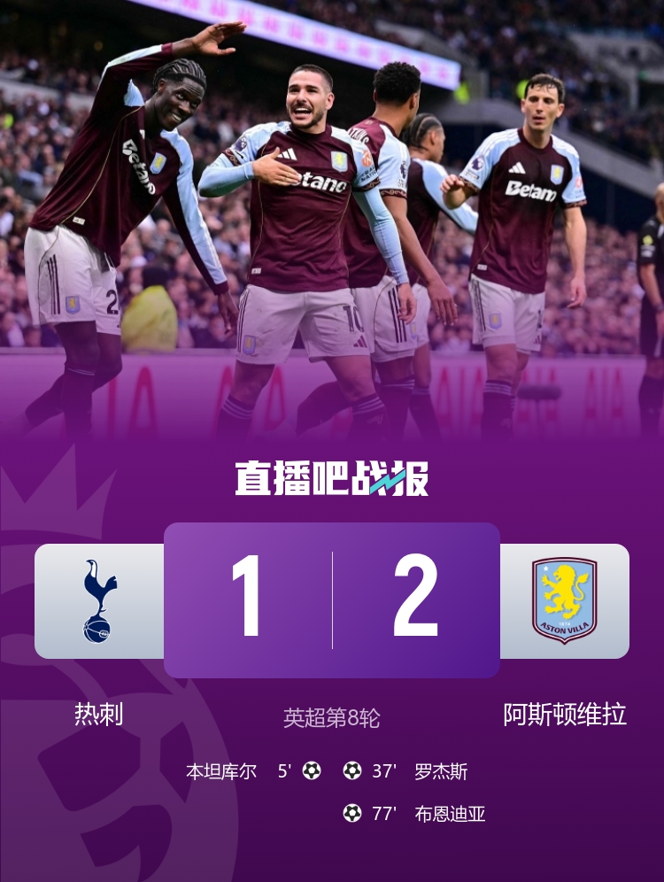 热刺近4轮仅获1胜,维拉各项赛事5连胜;罗杰斯世界波,布恩迪亚、本坦库尔建功。 2分领跑!皇马1-0九人赫塔费 姆巴佩制胜维尼修斯替补造两红