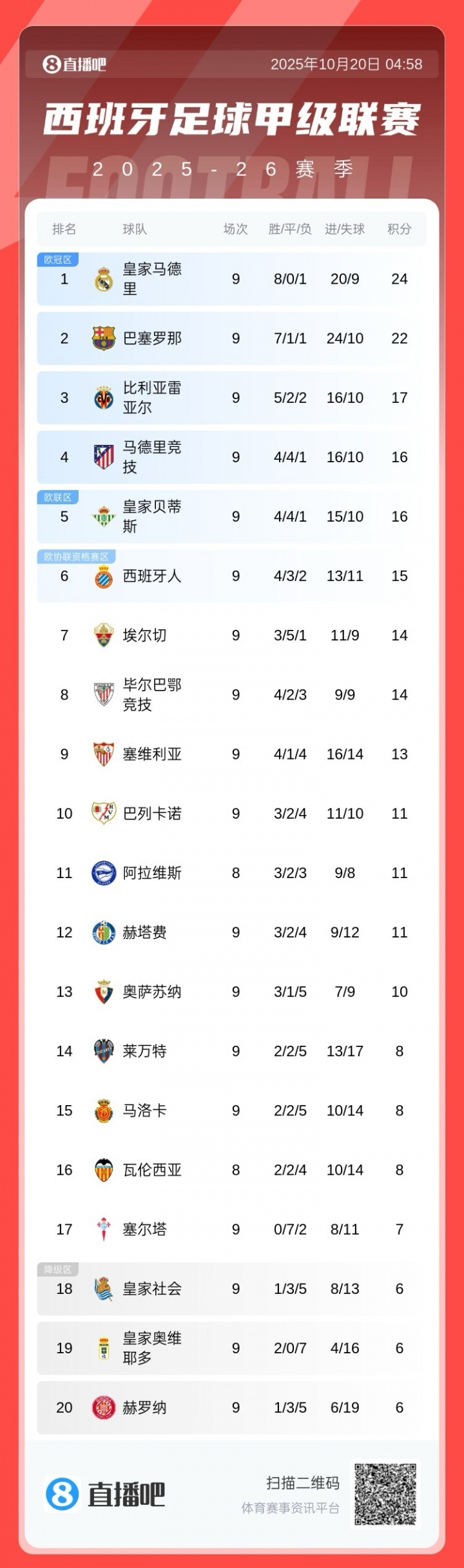 西甲积分榜:皇马2分优势领先巴萨,下轮国家德比