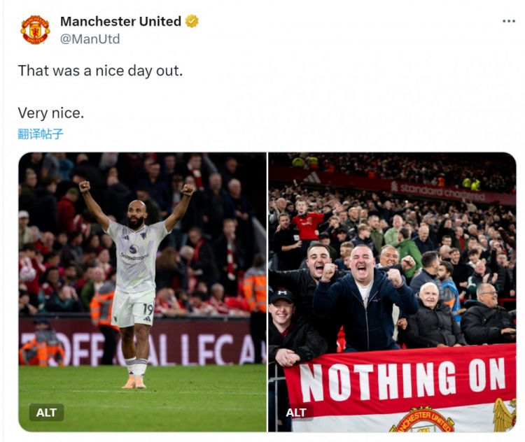 攻陷安菲尔德!曼联官方社媒庆祝胜利:美妙的