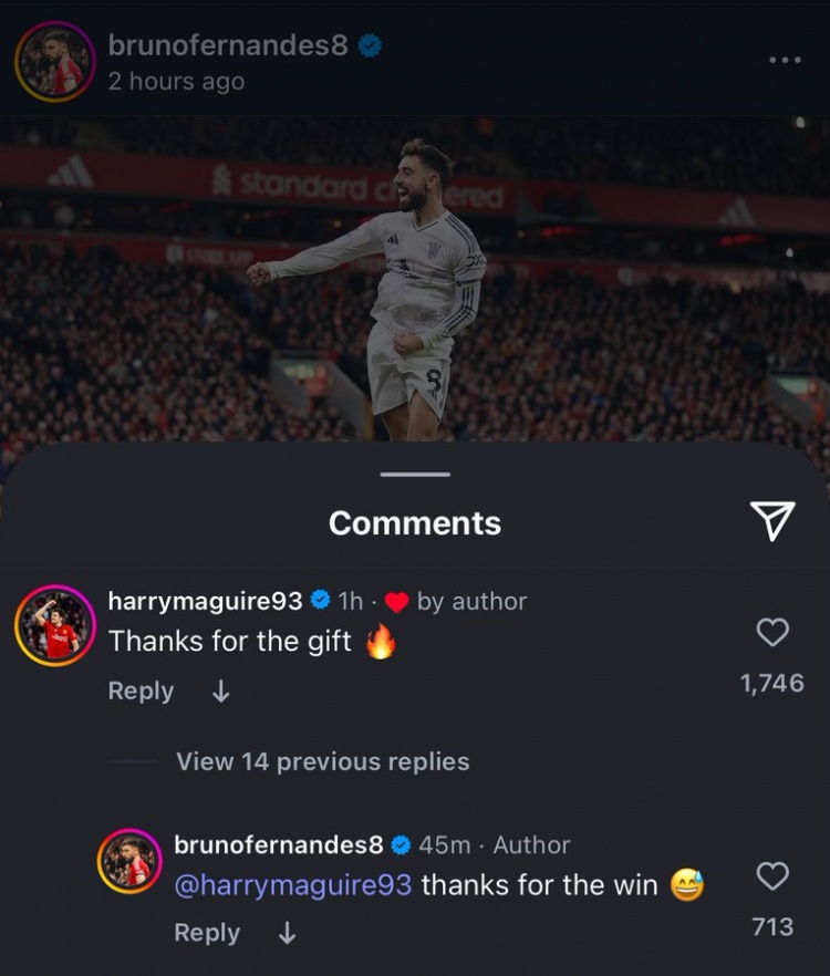 足球比分网10月20日讯 英超第8轮比赛,B费助攻马奎尔攻入制胜进球,曼联客场2-1击败利物浦。 B费赛后社媒晒照庆祝胜利,马奎尔留言:“谢谢你的礼物。” B费回复道:“谢谢你(为我们)赢得胜利。”