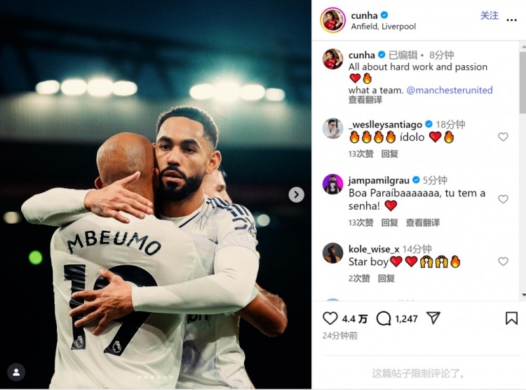 足球比分网10月20日讯 英超第8轮比赛,库尼亚踢满全场,帮助曼联客场2-1击败利物浦。 库尼亚社媒晒出与姆伯莫拥抱庆祝的照片,配文:“一切源于努力与激情,多么棒的球队!”