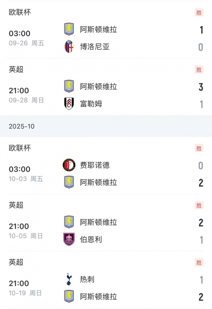 足球比分网10月19日讯 今晚英超维拉2-1逆转热刺,取得各赛事五连胜。 值得一提的是,维拉本赛季开局不利,联赛前五轮未尝一胜,但在上个月击败博洛尼亚后,埃梅里率队找回状态,各项赛事已经取得五连胜,并在客场逆转热刺。