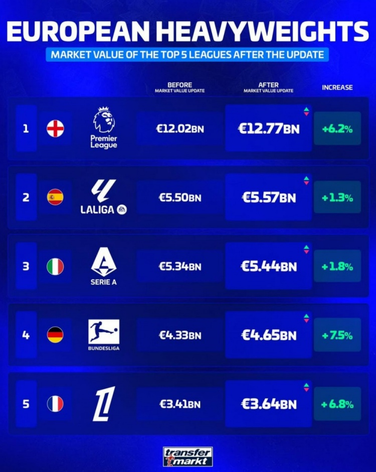 足球比分网10月20日讯 德转此前更新了足坛球员身价,并盘点了五大联赛球队总身价榜,其中英超遥遥领先,以下为具体情况: 1、英超 127.7亿欧,上涨6.2% 2、西甲 55.7亿欧,上涨1.3% 3、意甲 54.4亿欧,上涨1.8% 4、德甲 46.5亿欧,上涨7.5% 5、法甲 36.4亿欧,上涨6.8% |